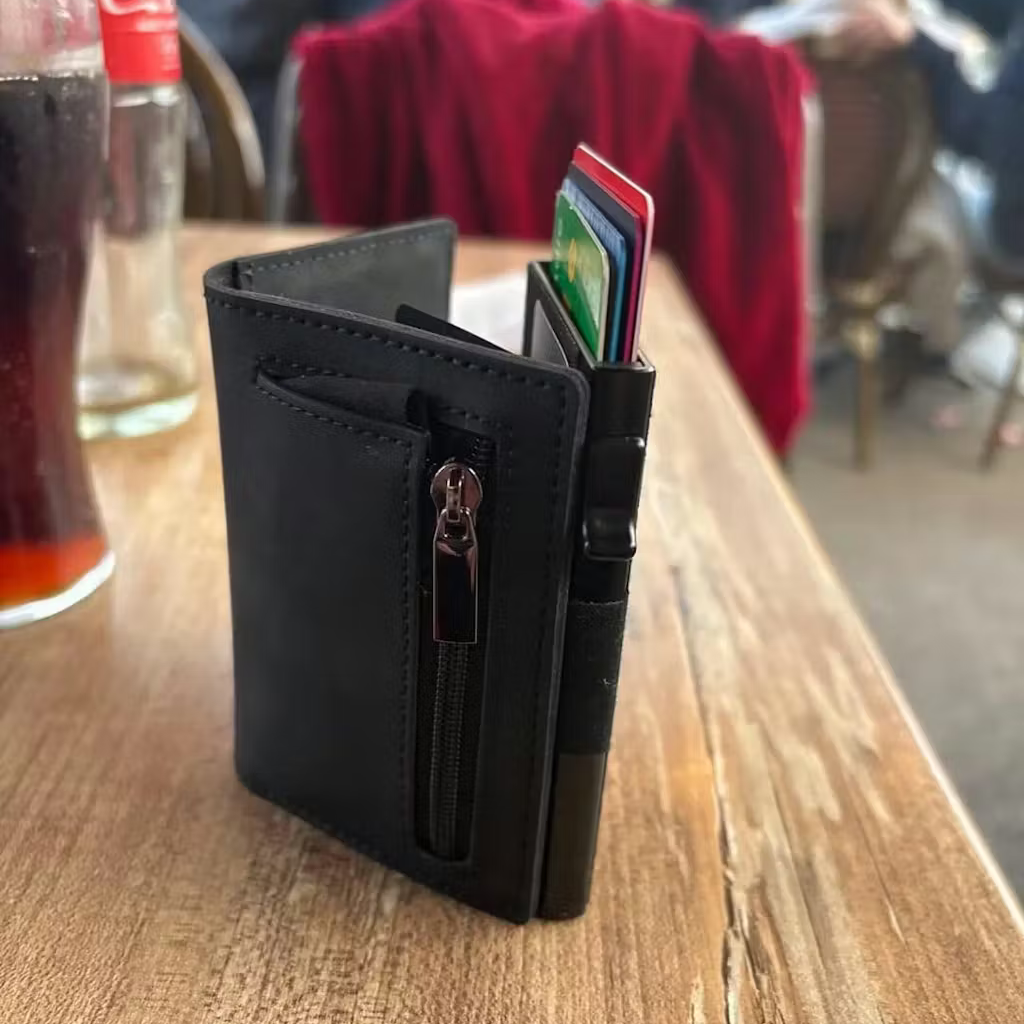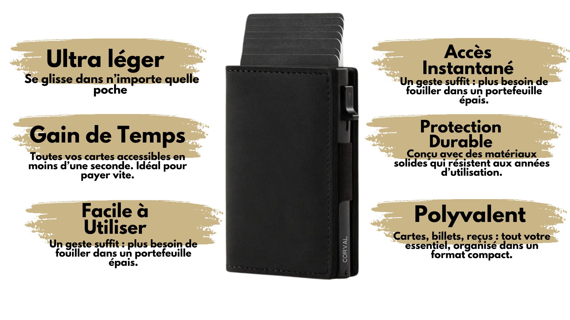 "A chaque passage en caisse, je stressais : mes cartes étaient mélangées, je fouillais trop longtemps et je me sentais maladroit devant les autres. Je voulais simplement être plus organisé… Ce portefeuille a réglé le problème : un clic et tout est là. Je gagne du temps, je suis plus serein et mes paiements sont devenus fluides et naturels."